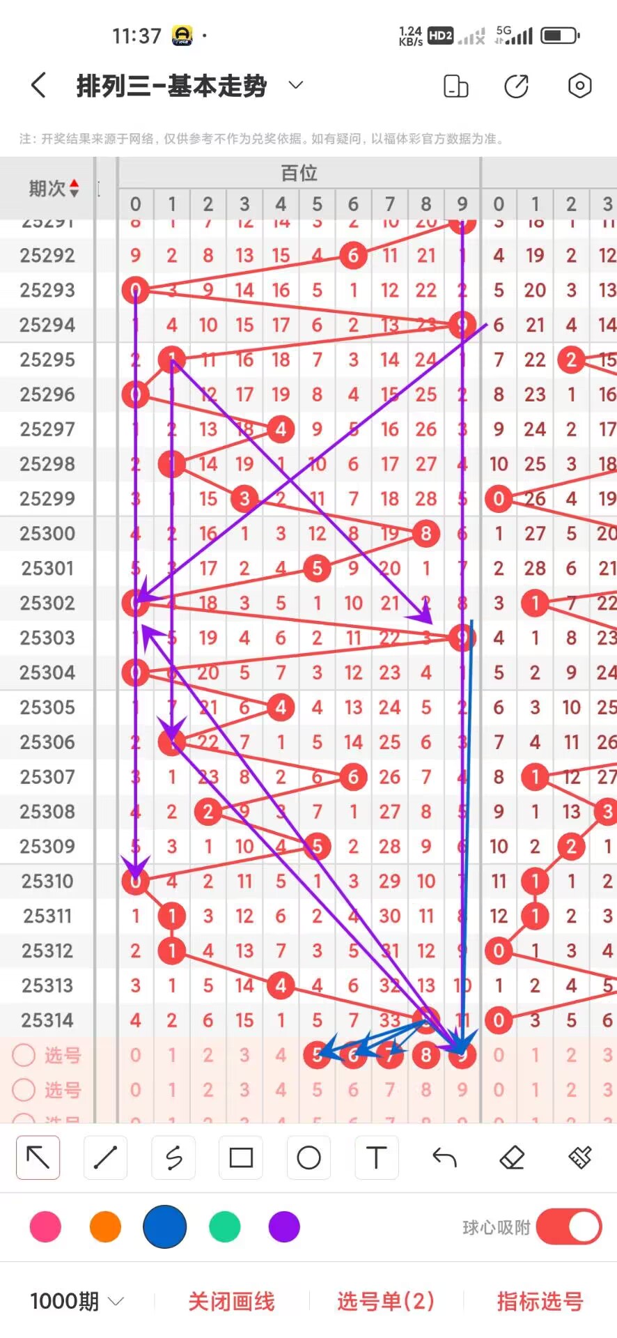 2025315期,上期十位开出偶数0,我们从1000期,走势图来分析012路,目前0路开出378次,1路开出315次,2路开出307次,通过走势我们可以看出在1000期内0路号码开始回补。重点关注2路号码,0路号码继续作为防守,在从奇偶比方面看。奇数开出502次,偶数开出498次,这两者之间走势差别不大,,我们在回过头来看大小方面的走势,大号目前开出486次。小号开出514次,可以看出小号目前下号最多,通过上面的走势分析我们可以看出,目前十位在冷号阶段的是奇数568,在热号状态的是014,重点关注2路号码,特别码关注79,防热号继续下号,具体看走势图