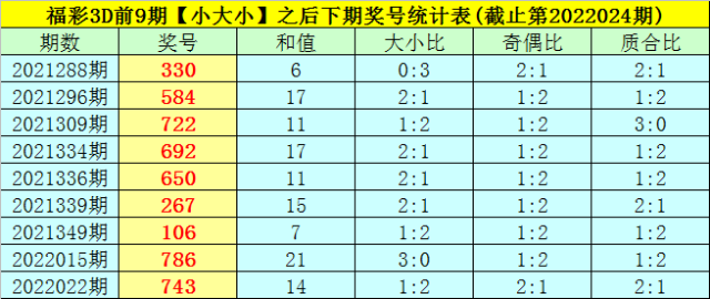 一、上期回顾:福彩3D第2022024期奖号为:472,奖号类型开出组六,大小比为1:2,奇偶比为1:2,和值为13,跨度为5,012路比为0:2:1。