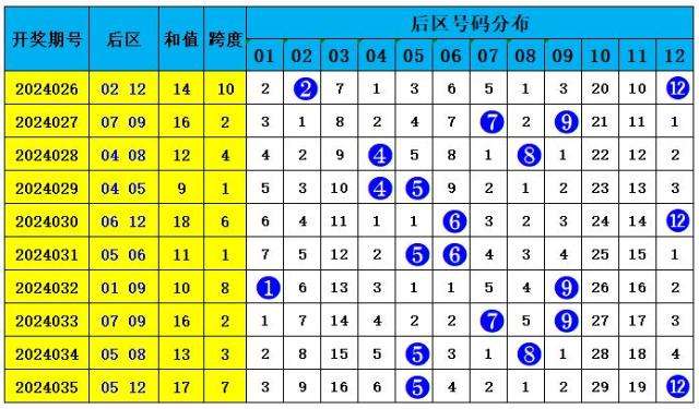 后区上期开出号码05、12,奇偶比为1:1,近十期后区奇偶比为10:10,总体看奇、偶数走势相同,本期后区要注意奇偶比1:1,五码复式参考02 03 04 06 07,重点两码推荐:03、04