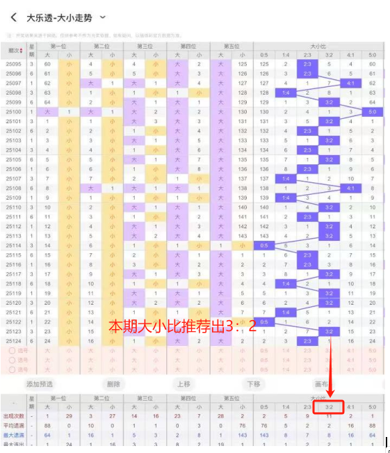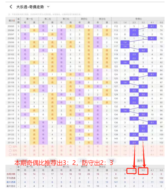 6、大小比:上期开出大小比为2:3,近81期开出4:1出现19次,3:2出现32次,2:3出现43次,1:4出现27次,5:0出现3次,本期推荐出3:2,本期重点推荐出3:2。