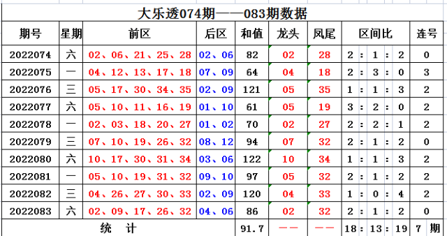 上期回顾,大乐透第2022083期开奖,本期奖号:前区02 09 17 26 32;后区04 06,当期前区号码大小比为2:3,三区比2:1:2,奇偶比为2:3。前区未开出连号,开出重号26。