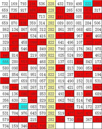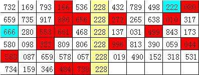 在以上统计表中,组选号码228开出之后,其下期组三号码出现6次,组六号码出现13次。其中,下期奖号有10期无重号,有9期开出重号,本期预计重号开出,看好开出组六号码。