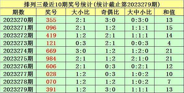 上期回顾:排列三第2023279期奖号为:391。奖号类型:组六,和值:13,奇偶比:3:0,跨度:8,大小比:1:2。