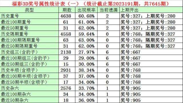 福彩3D第2023189期奖号为327,第2023191期奖号为768,隔期奖号出号7。从统计表中分析,最近100期隔期奖号出现63期,出现比例为63%,最近50期隔期奖号出现31期,出现比例为62%,最近10期隔期奖号出现 7期,出现比例为70%,本期防止试机号中号码轮空。