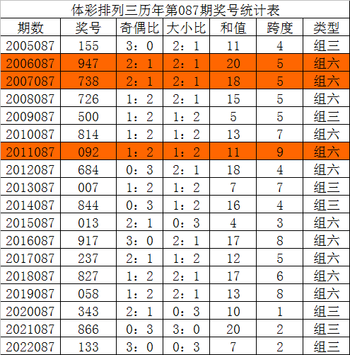 在历年排列三第088期开奖中:组三号码出现4次,组六号码出现13次。组六号码出现比例略高,本期奖号形态参考:组六号码。