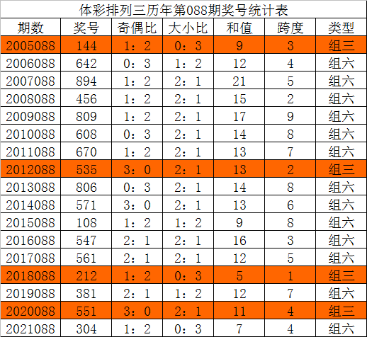 体彩排列三历年第088期开出奖号分别为:144、642、894、456、809、608、670、535、806、571、108、547、561、212、381、551、304。统计详见下表:
