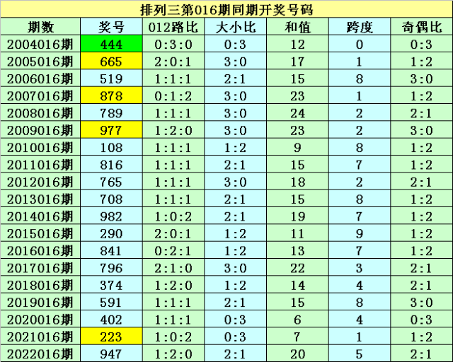 本期为排列三第2023016期开奖,开奖日期为:2023年1月16日,历史上排列三第016期已开出了19次奖号,历年同期开出号码分别为:444-665-519-878-789-977-108-816-765-708-982-290-841-796-374-591-402-223-947。