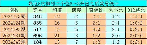 1、排列三前两期个位分别开出号码6和8,历史上个位号码连续两期分别出现6和8时,共有73次。在最近5次出现时,其下期分别出现号码:345、835、517、696、184;