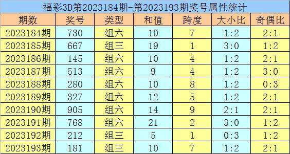 开奖回顾:福彩3D第2023193期开出奖号181。奖号形态为组三,奇偶比为2:1,012路比为0:2:1,大小比为1:2,和值为10,跨度为7。