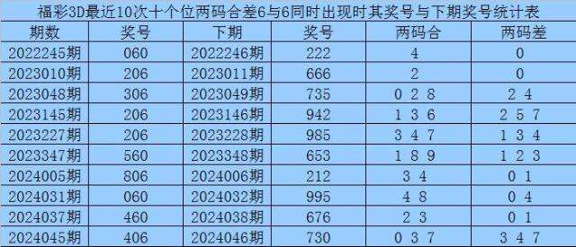十个位合差分析:上期奖号十个位开出06组合,两码合为6,两码差为6,最近10次十个位两码合6与两码差6同时出现时,其奖号和下期奖号分别为: