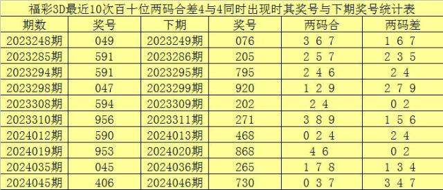 从以上统计可以看出,百十位两码合差4与4同时出现之后其下期两码合差表现最热的4个分别为:2347,本期百十位两码合差可以参考这四码中的数据。