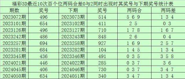 从以上统计可以看出,百个位两码合差0与2同时出现之后其下期两码合差表现最热的4个分别为:1345,本期百个位两码合差可以参考这四码中的数据。