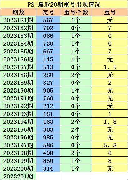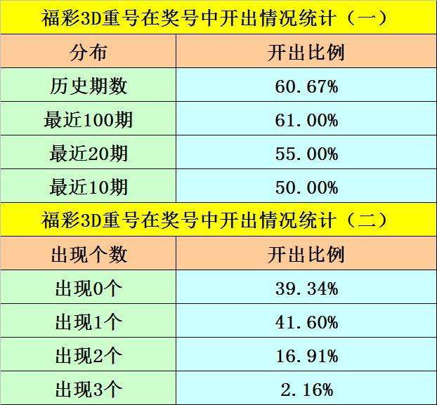 最近100期开奖中,含有重号的奖号有61期,最近20期含有重号的奖号有11期,最近10期含有重号的奖号有5期。本期注意重号落号。