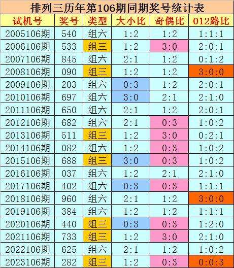 012路分析:历史上排列三第106期同期奖号中,012路奖号总个数比为26:11:20,012路奖号轮空期数比为3:10:6,今年第106期预计0路号码走冷轮空,看好012路比开出0:2:1。