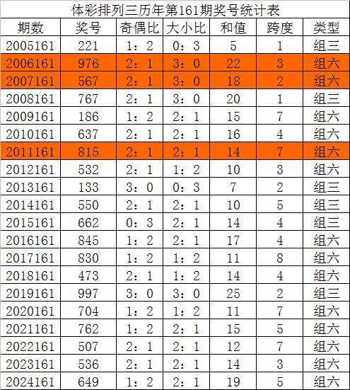 排列三第2024161期奖号为649,奇偶比为1:2,大小比为2:1,和值为19,跨度为5。