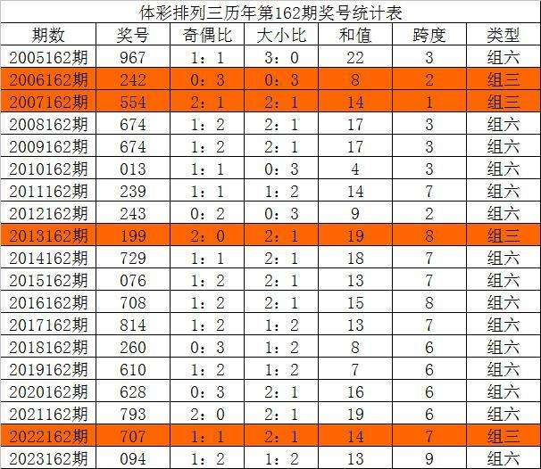 体彩排列三历年第162期开出奖号分别为:967、242、554、674、674、013、239、243、199、729、076、708、814、260、610、628、793、707、094。统计详见下表: