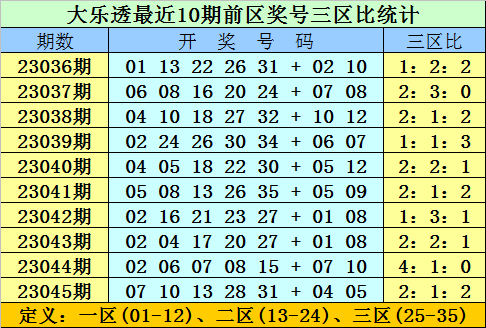 上期开奖:体彩大乐透第23045期奖号:07 10 13 28 31 + 04 05,前区奖号三区比为2:1:2。