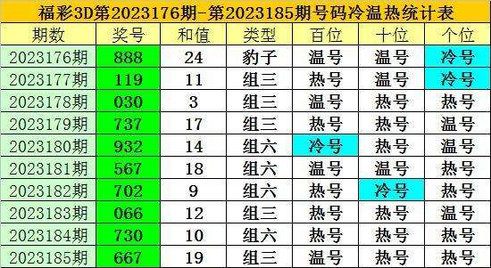 上期回顾:福彩3D第2023185期开奖奖号为:667,奖号类型为:组三,奖号冷温热态为:温号+热号+热号。