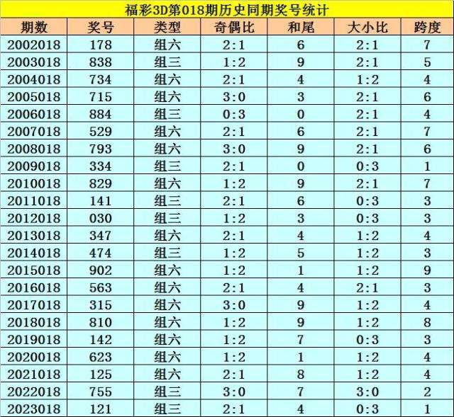 福彩3D历年第018期同期奖号为:178 838 734 715 884 529 793 334 829 141 030 347 474 902 563 315 810 142 623 125 755 121。