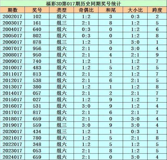 福彩3D历年第017期同期奖号为:102 161 640 802 878 956 950 740 483 813 538 380 057 027 531 817 659 559 434 780 348 053 659。