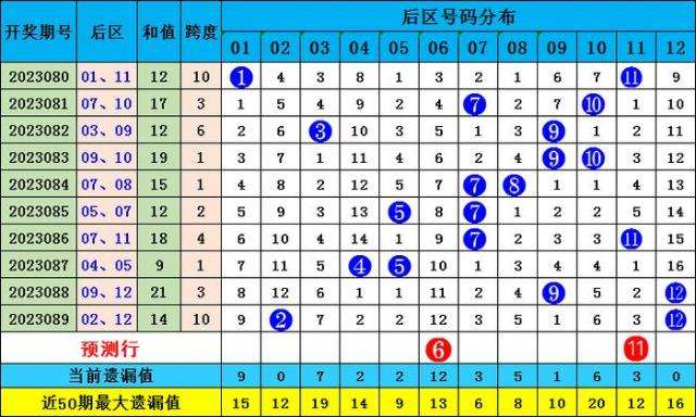 上期后区开出2、0路号码组合:02 12,最近10期后区奖号012路比为6:8:6,1路出号频次较高;本期后区奖号继续关注0路和2路,后区参考:06 11。
