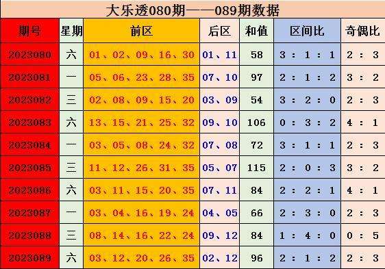 大乐透第2023089期奖号为:前区03 12 20 26 35,后区02 12,区间比:2:1:2,奇偶比:2:3。和值:96