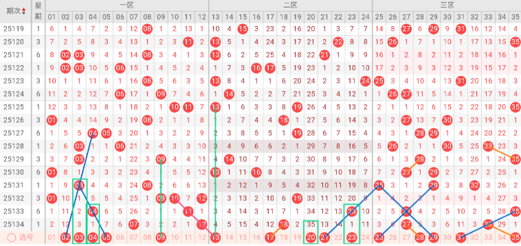 三区(25-35)分析:上期该区开出号码 27 33,近10期占比38%,与上期相比无变化。本期无三斜连号趋势,隔码斜连走势:25 29 31。近5期在0-3码间宽幅震荡后,近期稳定在2码,表明三区在经历空开后已恢复稳定,但波动性仍然存在。近五期四期开出2-3码,三区整体活跃度较高,本期三区可能会适当回调。推荐关注号码:25、28、29、31、35。