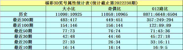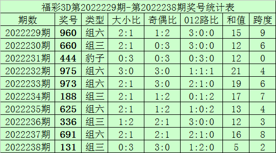 开奖回顾:福彩3D第2022238期奖号为131,其中奖号大小比为0:3,奇偶比为3:0,012路比为1:2:0,和值为5,跨度为2。