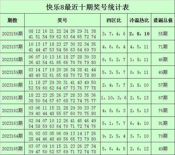 福彩快乐8第2023165期开奖回顾:03 07 09 10 15 21 23 26 27 34 39 47 50 52 57 69 71 72 74 78,其中奖号四区比为5:6:4:5,冷温热码比为2:6:12,遗漏总值为49。