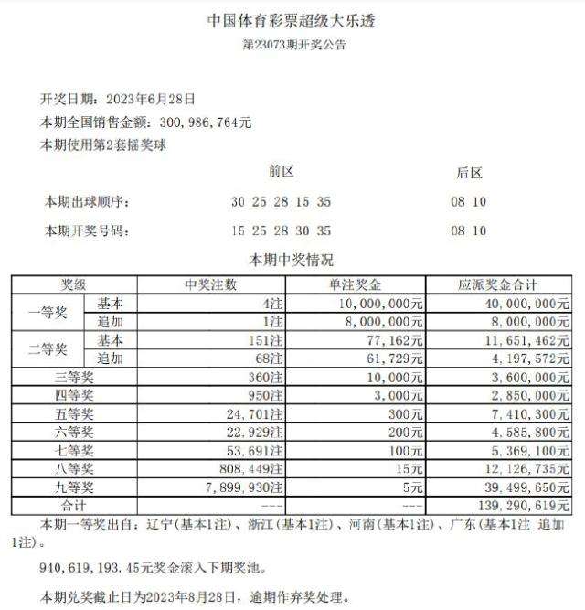 北京时间6月28日晚,体彩大乐透第23073期开奖,当期开奖号码为:前区15 25 28 30 35,后区08 10。