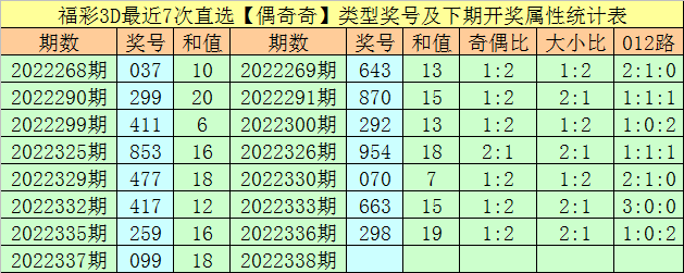 开奖回顾:福彩3D第2022337期开奖号码为099,奖号直选类型为:偶奇奇、小大大和000路。