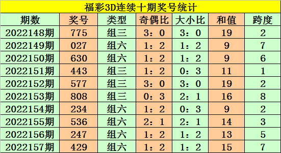 上期回顾:福彩3D第2022157期开出奖号:429。奖号为组六形态,与试机号没有同,奇偶比为1:2,大小比为1:2,012路比为1:1:1,和值为15,跨度为7。