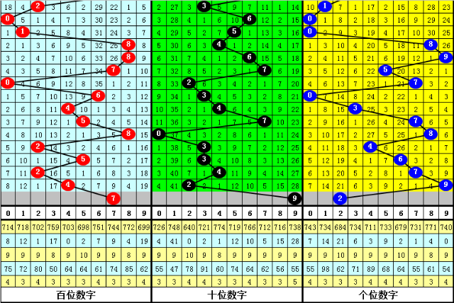 百位分析:该位最近10期开出了2个0路号码、3个1路号码、5个2路号码,2路号码热出,0路号码走冷。本期排除2路号码,参考号码:7。