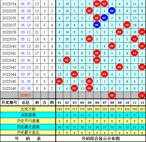 上期开奖:大乐透第2022046期开奖号码:06、07、12、22、27+03、05,前区开出3个尾数2、6、7,其中包含同尾号码:12 22、07 27。