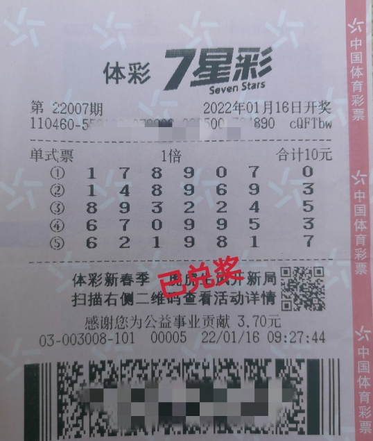 1月16日晚,在体彩7星彩第22007期开奖中,李先生通过一张10元5注的单式票中得1注一等奖500万元。