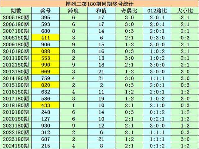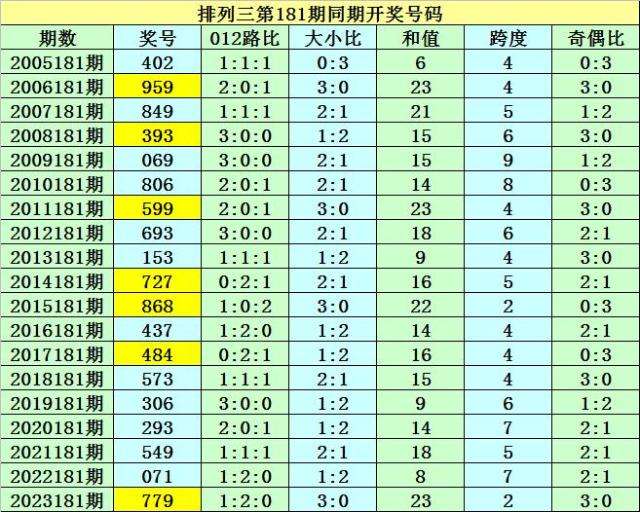 本期为排列三第2024181期开奖,开奖日期为:2024年7月9日,历史上排列三第181期已开出了19次奖号,历年同期开出号码分别为:402-959-849-393-069-806-599-693-153-727-868-437-484-573-306-293-549-071-779。