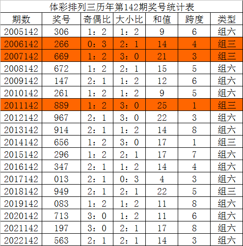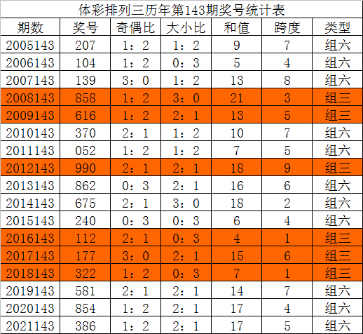 在历年排列三第143期开奖中:组三号码出现6次,组六号码出现11次。组三、组六号码出现比例持平,本期奖号形态关注:组六号码。
