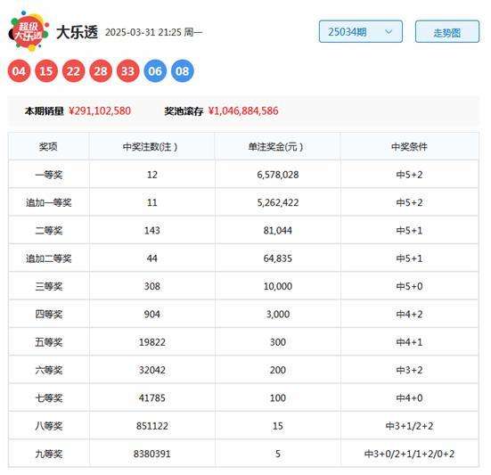 大乐透第2025034期奖号开出:04 15 22 28 33+06 08。其中前区三区比为1:2:2,和值为102,包含1个重号:33,没有开出连码,后区开出一奇一偶、一大一小奖号。