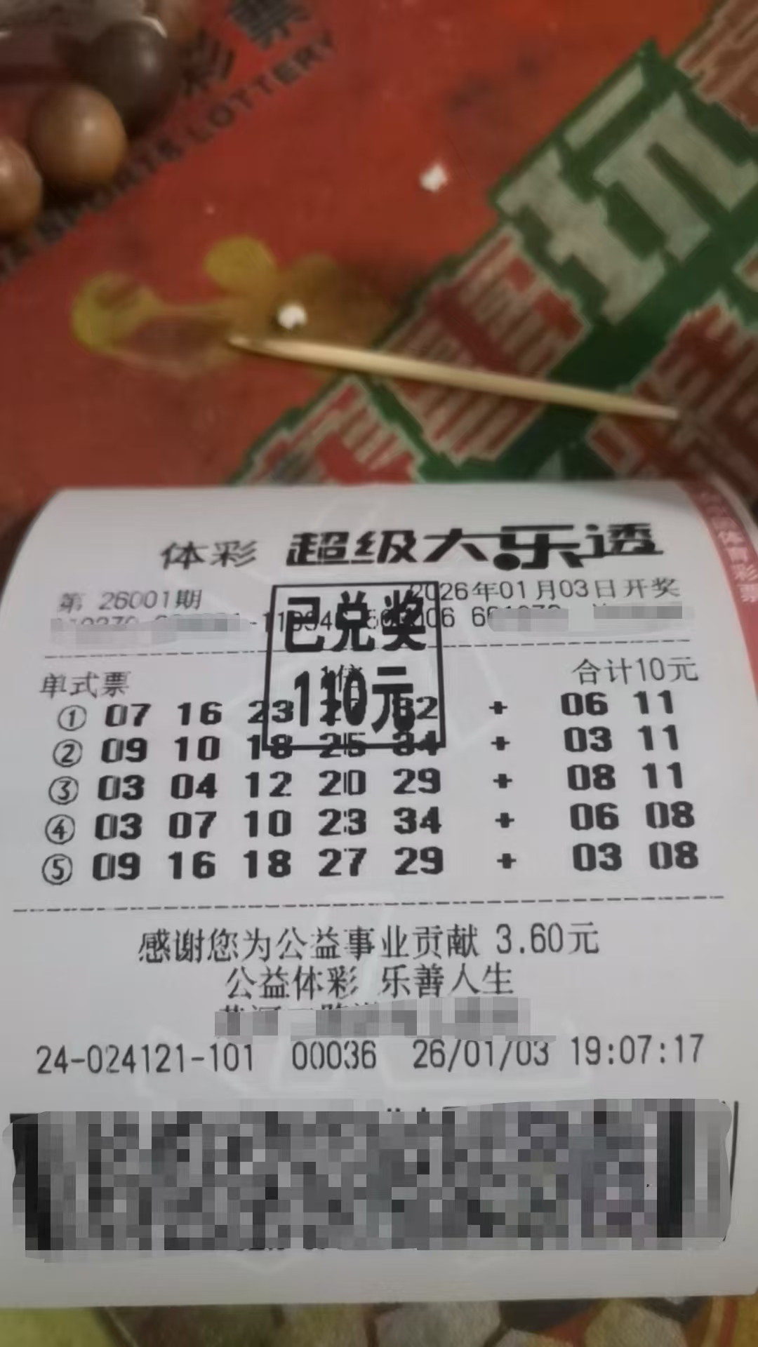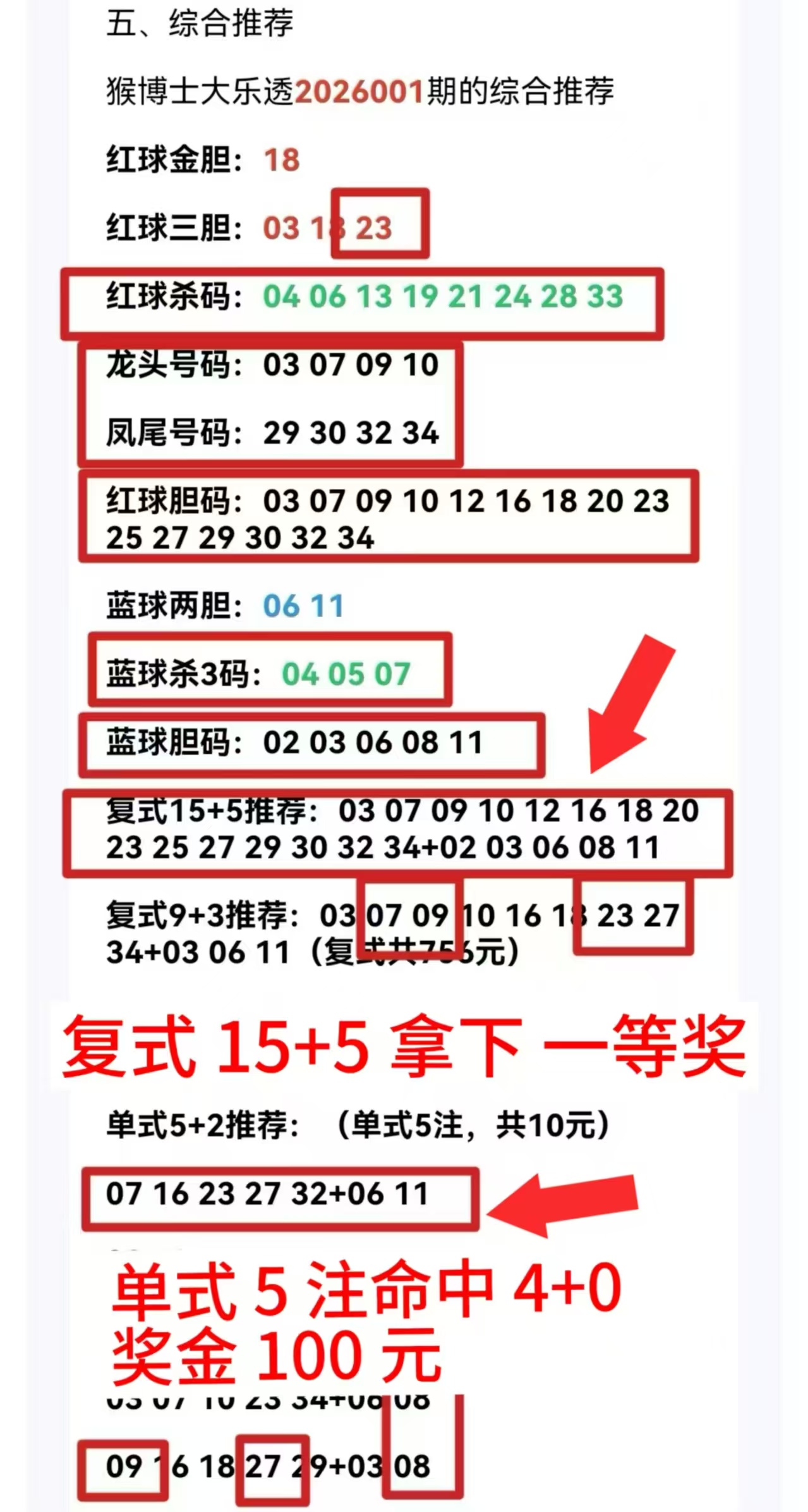 26001期,复式命中大乐透一等奖,奖金734万元,单式5注命中4+0,奖金100元