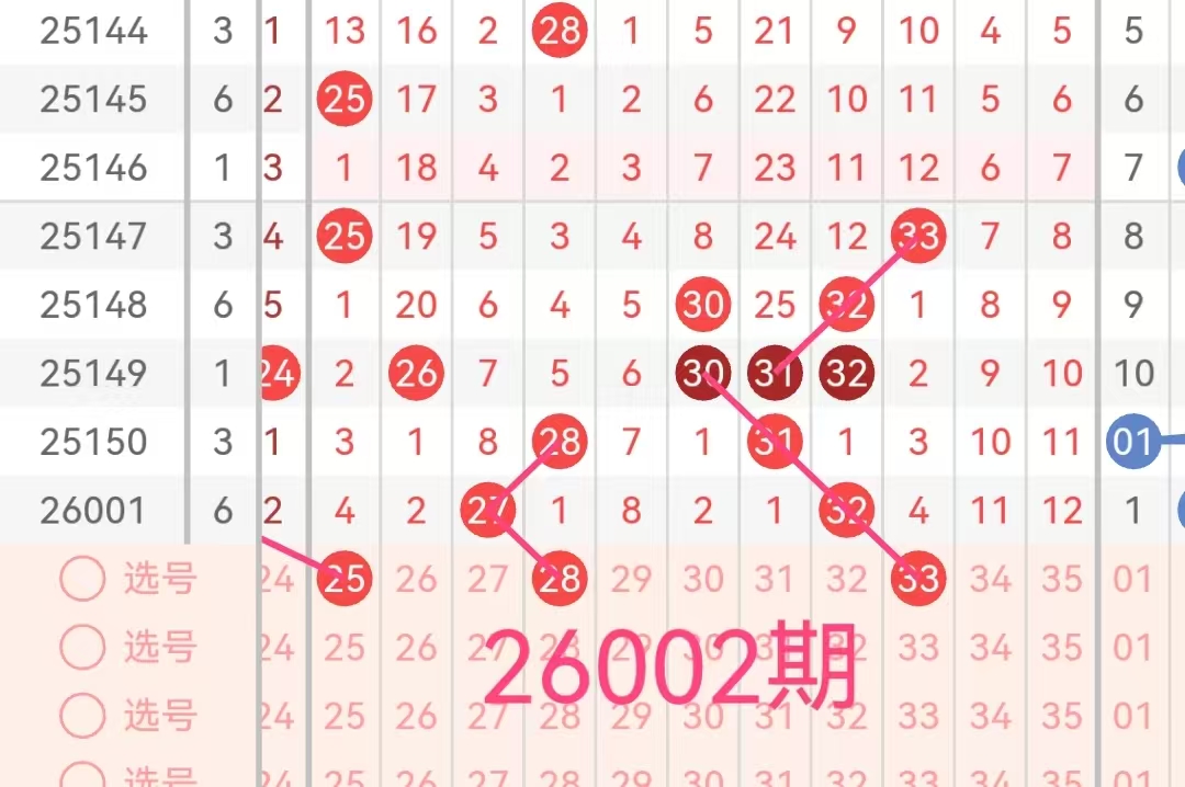 2. 凤尾号码分析:凤尾号码(前区最大号码)上期是32。这是一个大的凤尾,过去十期内,凤尾号码多集中在18到35之间,其中3字头号码表现较为活跃。因此,本期应重点关注18-35区间的数字,特别是号码21、25、28、33