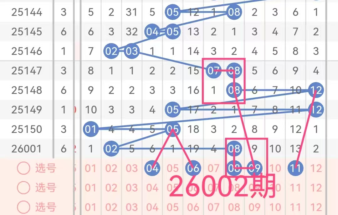 后区号码范围为01-12,分为两个区间:小号(01-06)和大号(07-12)。上期开奖号码为02和08,为一个小号一个大号的组合。