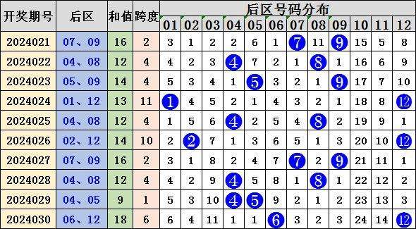 上期开出号码06 12,近10期跨度4、4、4、11、4、10、2、4、1、6,推荐跨度4,本期后区大范围推荐:01 03 07 08 12,主推号码:03 07。