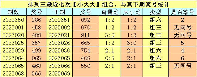 大小分析:排列三上期开出号码366,大小类型为【小大大】,最近七次开出大小类型小大大的奖号分别为:286、458、488、357、499、065、468,其下期分别开出号码:092、070、911、665、754、468、550。其中号码大小比为12:9,大小号码出现次数基本相当,本期注意大号转热,看好出现2个大号。
