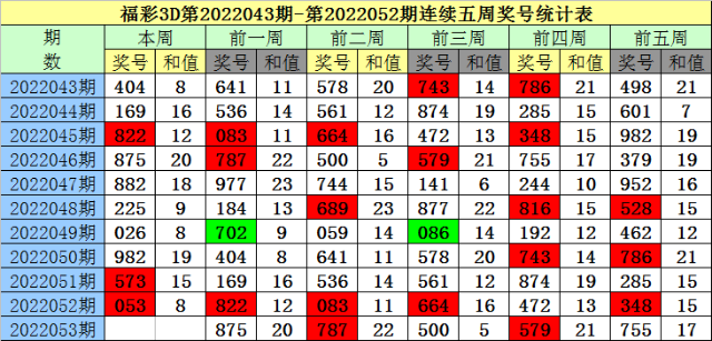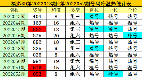 上期回顾:福彩3D第2022052期开奖奖号为:053,奖号类型为:组六,奖号冷温热态为:热号+冷号+热号。