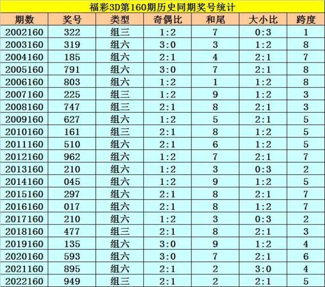 福彩3D历年第160期同期奖号为:322 319 185 791 803 225 747 627 161 510 962 210 045 297 017 210 477 135 593 895 949。