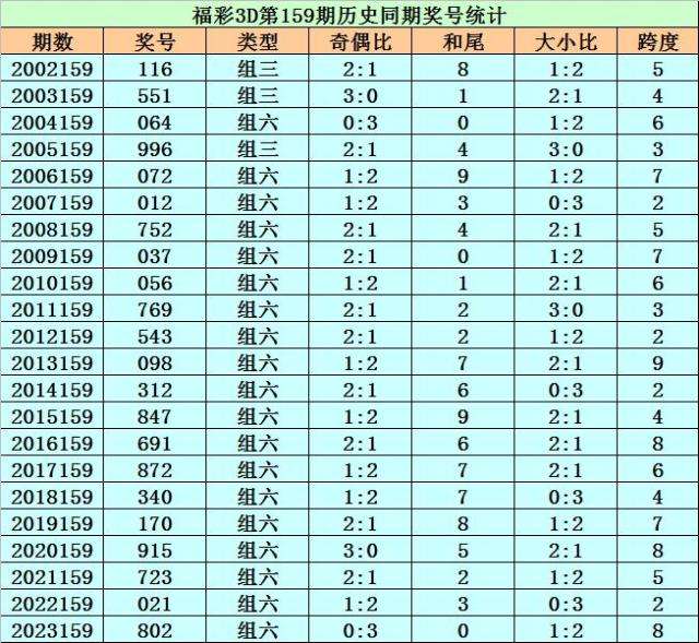福彩3D历年第159期同期奖号为:116 551 064 996 072 012 752 037 056 769 543 098 312 847 691 872 340 170 915 723 021 802。