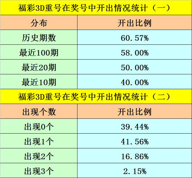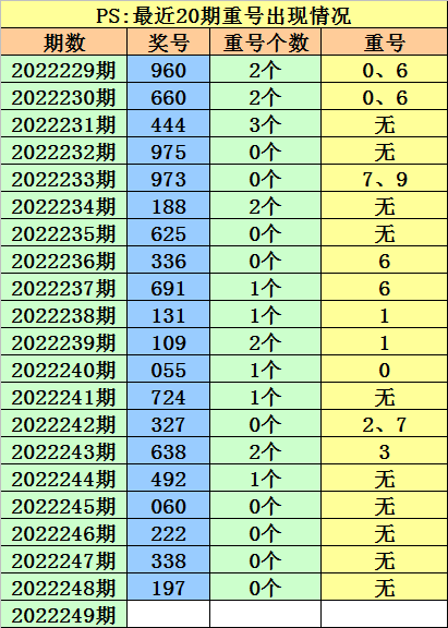 最近100期开奖中,含有重号的奖号有58期,最近20期含有重号的奖号有10期,最近10期含有重号的奖号有4期。本期注意重号落号。