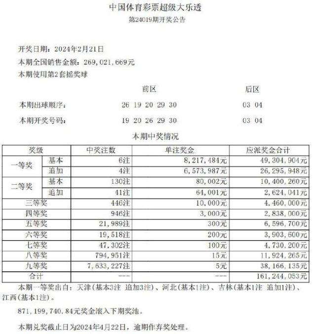北京时间2月21日晚,体彩大乐透第24019期开奖,当期开奖号码为:前区19 20 26 29 30 ,后区03 04;本期全国销量为2。69亿元,计奖结束后奖池余额8。71亿元。