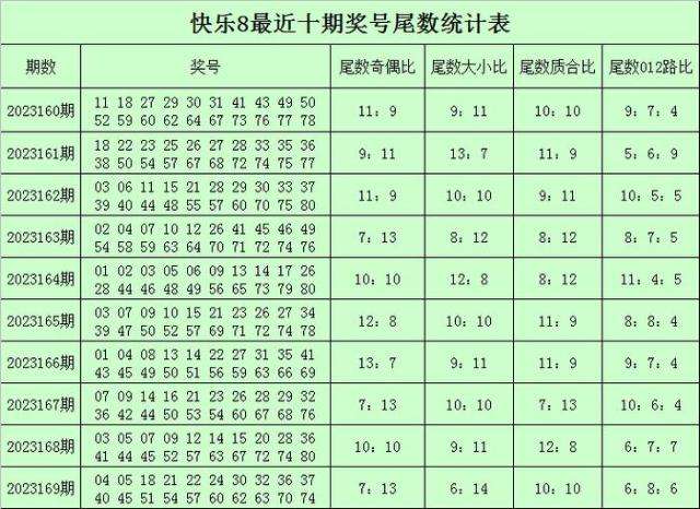 福彩快乐8第2023169期开奖回顾:04 05 18 21 22 24 30 32 36 37 40 45 51 54 57 60 62 63 70 74,其中奖号尾数奇偶比为7:13,尾数012路比为6:8:6,尾数大小比为6:14,尾数质合比为10:10。