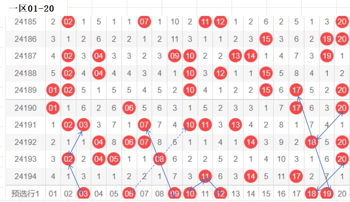 一区(1-20):遗漏5期以下有16个,0码有11 14 17, 3个.上期由于0-10小区开出0个,本区间共开出3码,回调本区,预计5码左右.近期数据奖码集中在10-20之间,平均数出码3.5.先定龙头,本区间有落位关系的号码具有联动关联之势,区间冷热交替走势明显,温区1-10之间,平均维持在2-3码左右,小区间选码慎选 ,10-20之间,在这区间比较热,重点参照区.本区走势比较明显,更多关注10-20之间.